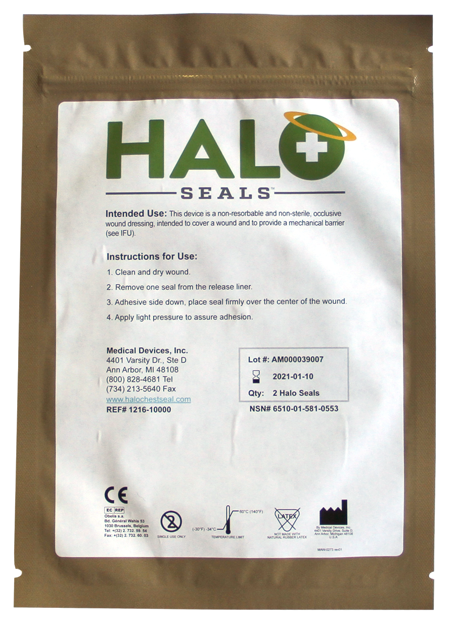 HALO Seal was created to treat tension pneumothorax, the second leading cause of preventable death on the battlefield. Halo Seal, an occlusive dressing, is durable with an aggressive adhesive, easy to use and performs in a wide range of operational environments.