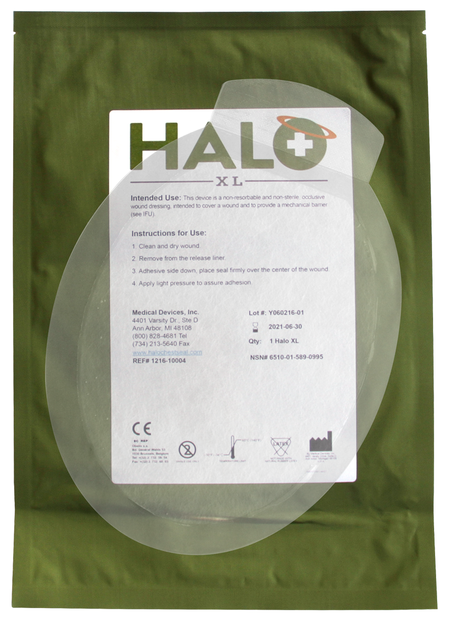 HALO XL was created to treat a tension pneumothorax, the second leading cause of preventable death on the battlefield. The XL is ideal for securing gauze and covering surgical incisions. The HALO XL is an occlusive dressing, is durable with an aggressive adhesive, easy to use and performs in a wide range of operational environments.
