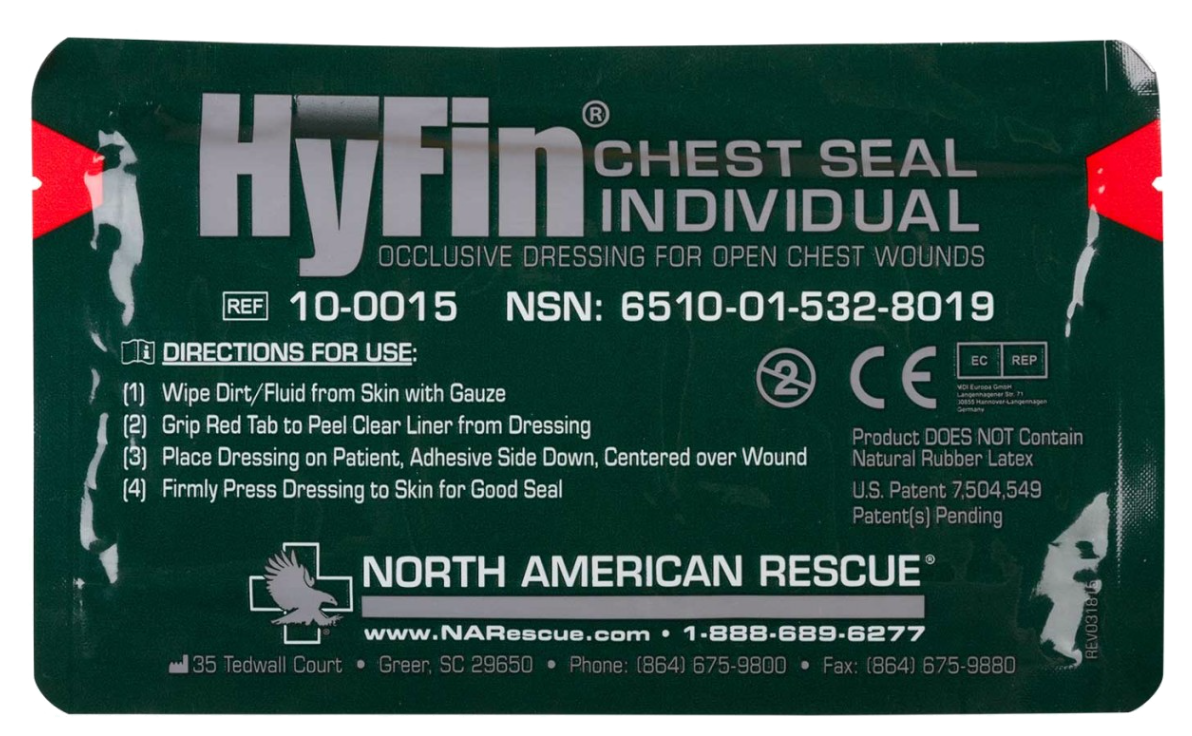 Featuring a large 6 x 6 in. size, the transparent design allows for accurate placement directly over the wound, easily conforming to the casualtys chest. A large, easily-visible red elliptical tab facilitating single step peel-and-adhere application is incorporated into the HyFin's design. Made in America and 100% latex free, each chest seal is packaged using its signature Red Tip Technologyred tear notches in a rugged, easy-to-open, foil pouch to ensure high quality performance.