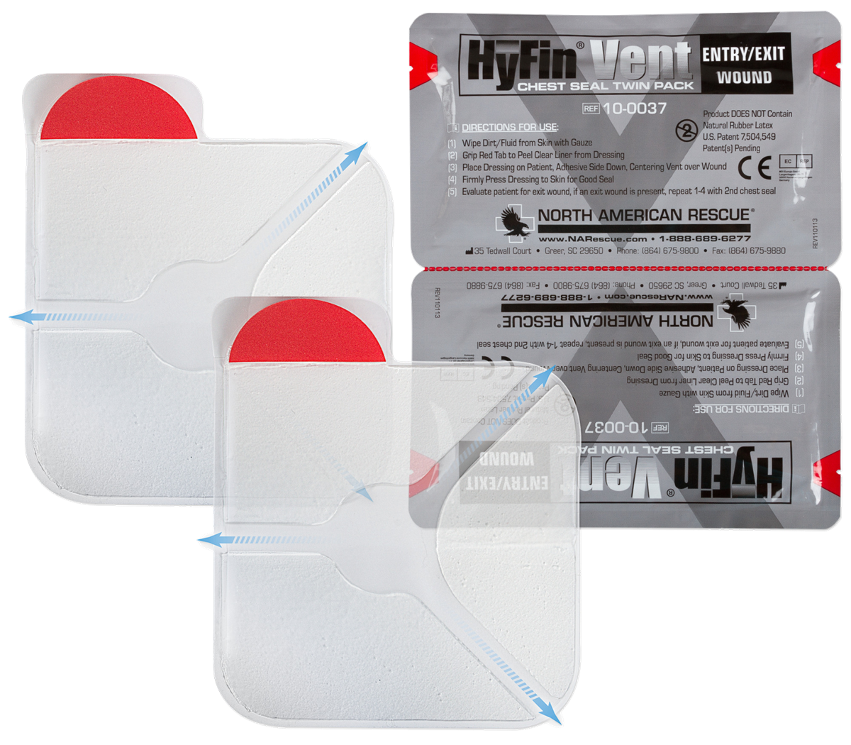 Advanced adhesive technology provides superior adhesion as the HyFin Vent Chest Seal Twin Pack is specifically designed to overcome adverse conditions in austere environments where the casualty may be covered in blood, sweat, body hair, or other environmental contaminants when a reliable chest seal is mandatory. Packaged in a more compact, rugged, easy-to-open twin foil pouch, each chest seal also includes a gauze pad to wipe the wound surface prior to application. The HyFin Vent Chest Seal Twin Pack has a large red pull tab for single-step peel-and-apply application, while the transparent backing facilitates easy placement over the wound area, conforming to the patients chest.