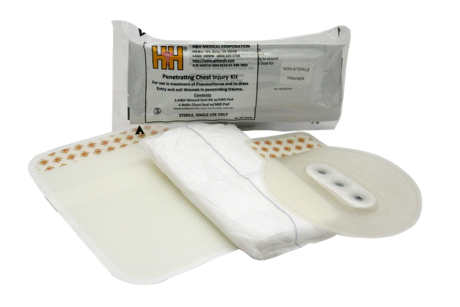 The H&H sterile Penetrating Chest Injury Kit provides proven emergency care for general, sucking, and exit chest wounds. The Penetrating Chest Injury Kit combines two of our most popular products, pre-sterilized and vacuum sealed in a 5 mil poly bag for easy storage and use. The Penetrating Chest Injury Kit contains: