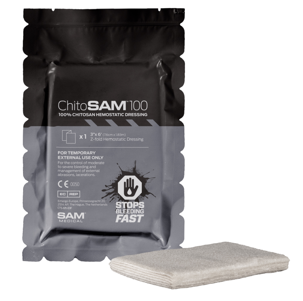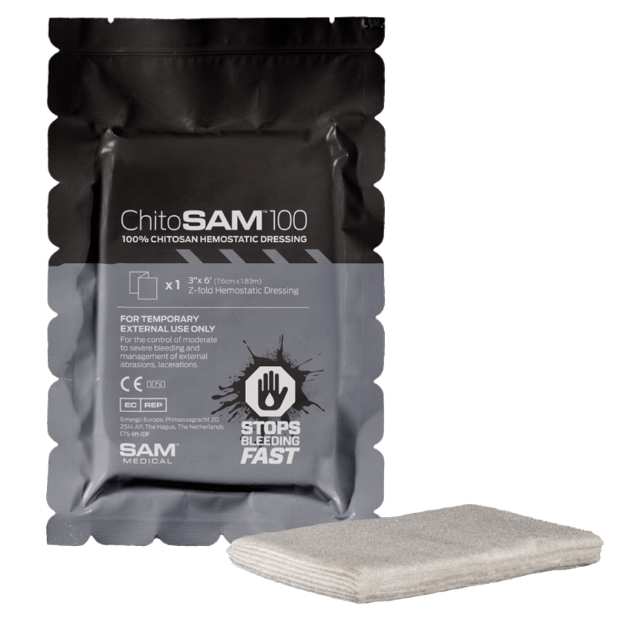 ChitoSam 100 is a high-performance hemostatic, non-woven chitosan dressing spun directly from chitosan derived crustaceans or snow crab shells. Designed to stop lethal bleeding rapidly, its ease of use is extremely effective. Works independently from the body's normal clotting processes.