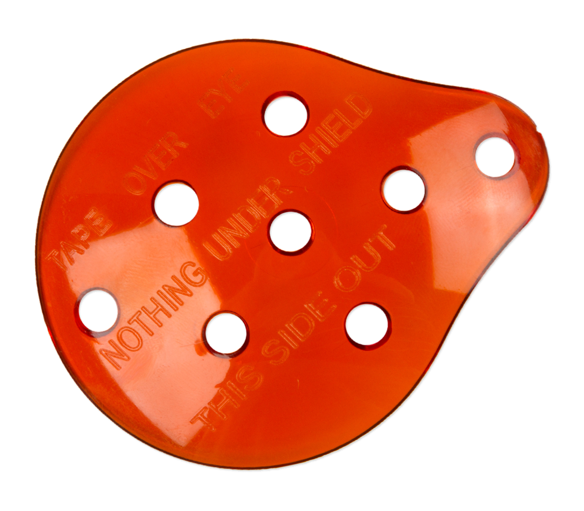 The Polycarbonate Eye Shield meets current military and civilian pre-hospital guidelines for the treatment of traumatic eye injury in the field. This convex rigid eye shield allows the user to protect the injured eye and blocks external pressure from being applied directly to the injury, preventing further damage. Made of a high strength, translucent orange polymer, the PES is shatterproof and will not flatten or disfigure when pressure is applied. Holes in the eye shield provide ventilation, and it designed for use over either eye. The outer shell has engraving that states Tape over eye this side out. Nothing under shield. Available as a single shield or in a box of 100.