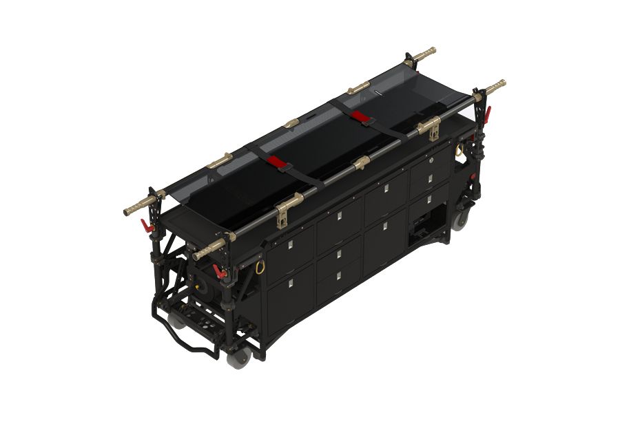 Our Air Mobile Surgical Table, a.k.a. AMST (A-mist) is a self contained surgical platform that is Air Worthy Certified for fixed and rotary wing platforms. The AMST provides rapid surgical capability immediately on arrival in a target area or may be utilized on mission support aircraft. It has provisions for surgical packs, anesthesia, monitors, oxygen, surgical trays and can be customized to your specific medical equipment set preferences. Optional Off Road Mobility Kit is also available.