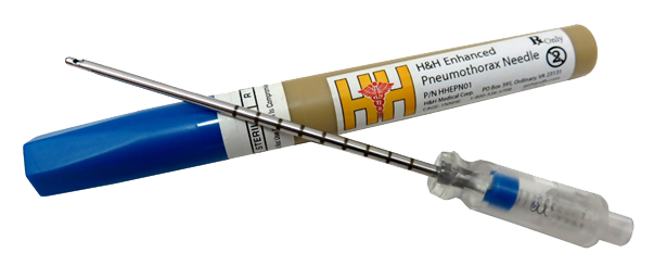For over two years, H&H Medical worked on an improved method for performing a needle decompression. We are pleased to announce the availability of the new H&H Enhanced Pneumothorax Needle (EPN). The EPN is designed with a hollow, closed-end stylet, spring loaded safety tip housing a 14 gauge interior diameter catheter that is 8.6cm in length.