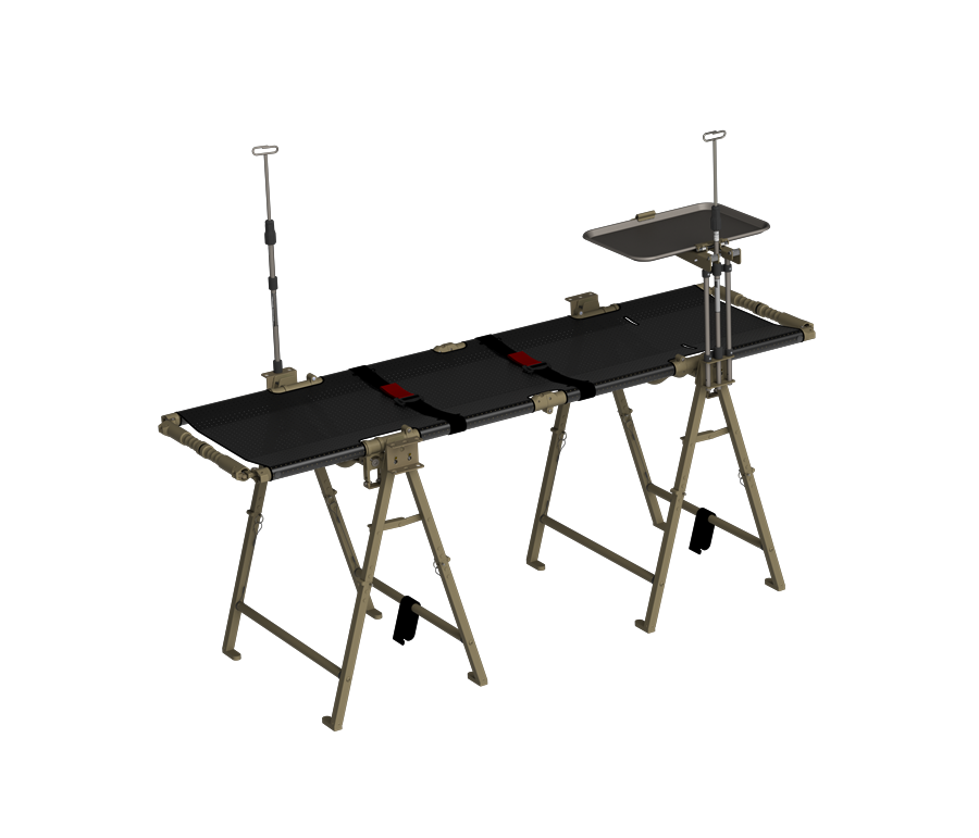 The Compact Treatment Station (CTS) is specifically designed with packability, mobility and immediate deployment in mind. Our Compact Litter Stands fold small enough to fit into multiple deployment hard cases and various Load Out Bags. The compact size of the (CTS) provides US Forces with a readily available station for casualty treatment. The CTS Kit includes (4) mounting brackets, (1) folding mayo stand, (1) Mayo tray and (4) IV poles for advanced treatment. Litter Stands are load and cycle tested in pairs and will support 500 lbs. Compact Litter stands will accept all rigid NATO litters. Optional transport case can store CTS Kit, SOF-Litter (quad-fold litters) and is fieldedin the current SOCOM TCCC CASEVAC sets and Norwegian Pre-Hospital Medical System.